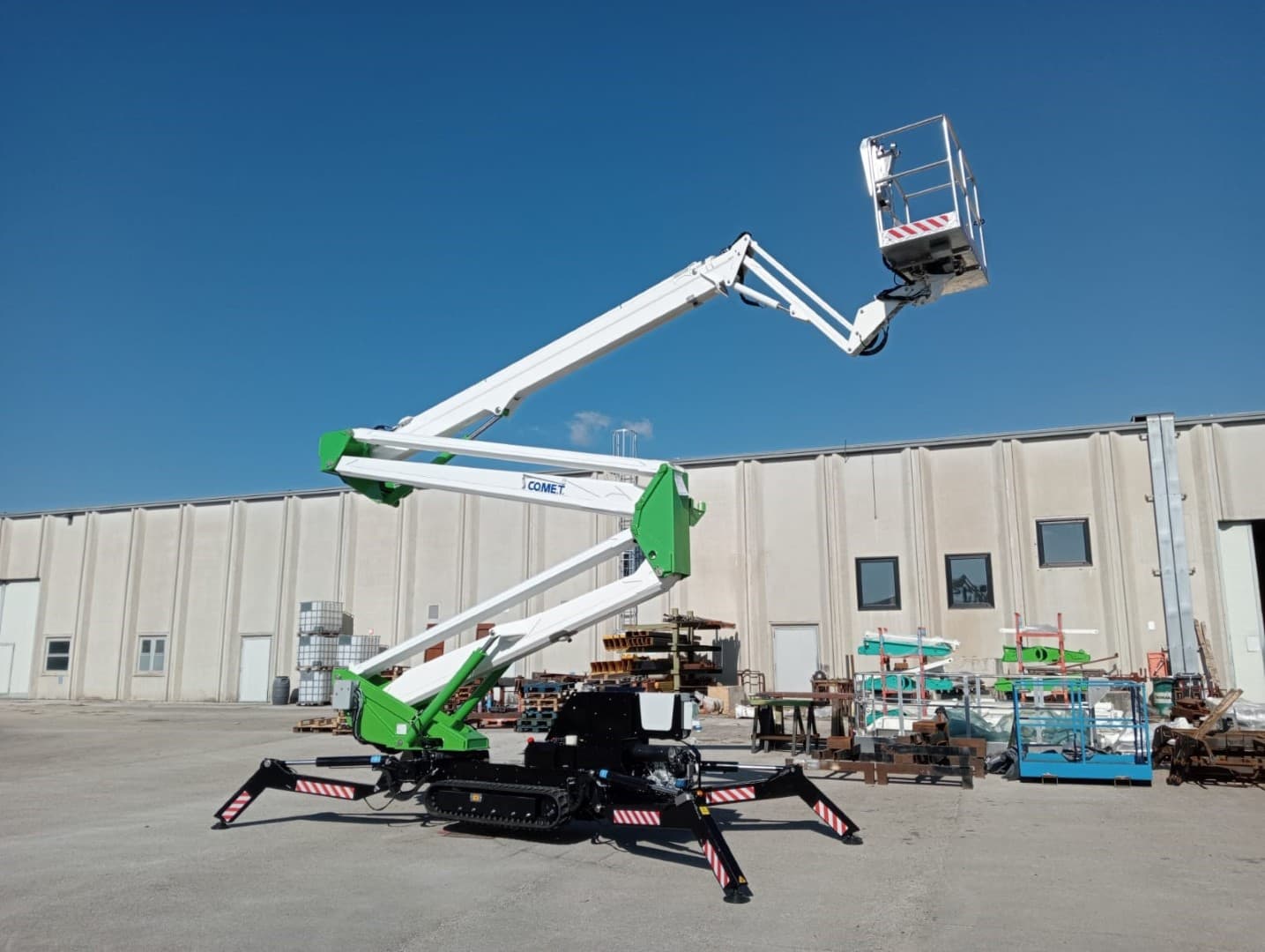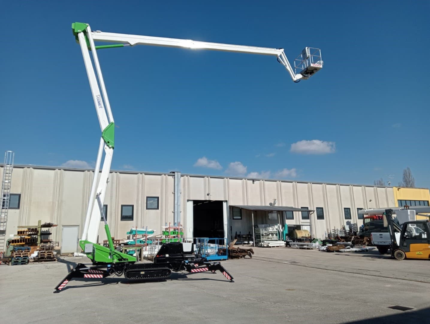 Hochleistungs-Arbeitsbühne aus hochfestem Stahl – für hohe Stabilität des Auslegers und maximale Sicherheit bei Arbeiten in der Höhe. Standardmäßig ausgestattet mit: Benzinmotor (andere Optionen möglich), 4 umlaufende Stabilisatoren, Pantograph – Teleskopausleger: 1 feste + 1 teleskopische Verlängerung, Struktur aus hochfesten Stahlrohren, Stromanschluss im Korb 230 V, Motorstart- und stopp vom Korb aus, abnehmbare magnetische gelbe Rundumleuchte, Stundenzähler zur Überprüfung der Betriebsstunden und der Häufigkeit der planmäßigen Tests, hochfeste Stahlkonstruktion garantiert maximale Arbeitssicherheit und hohe Stabilität